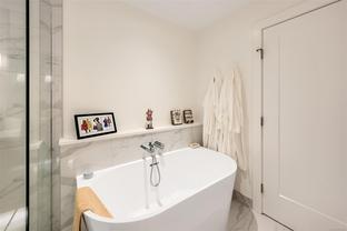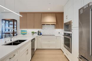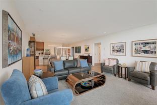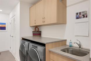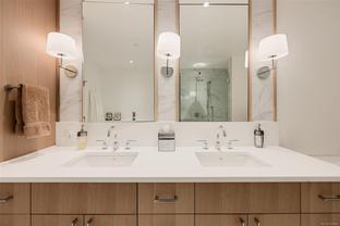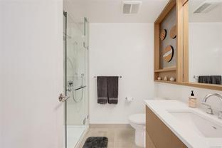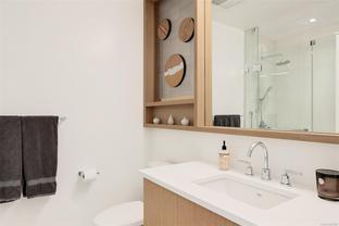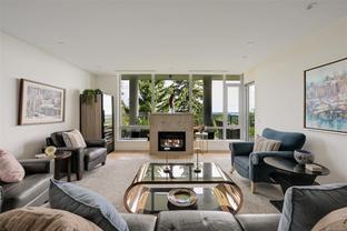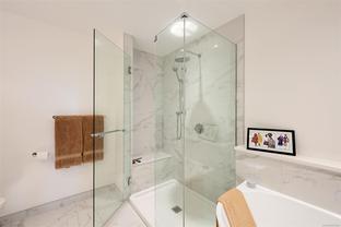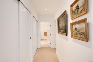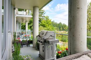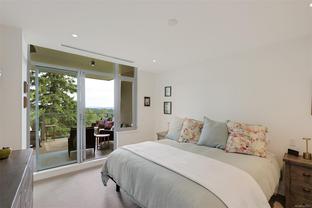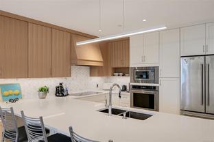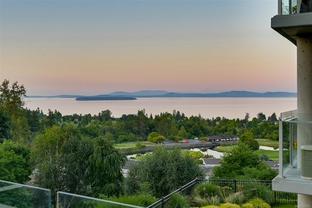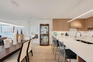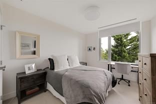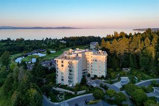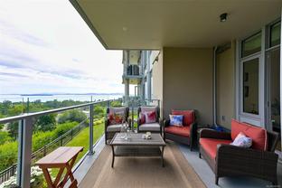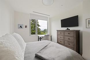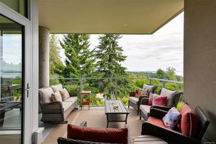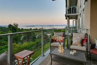 Luxury living at Sayward Hill in this over 1,800 sq ft 2 bed + den + media room home with beautiful ocean views. Thoughtfully designed with 8'9" ceilings, engineered hardwood, custom millwork, and large windows with roller shades. The chef’s kitchen features stone counters, premium KitchenAid appliances, and a 36” rangetop. Spa-inspired ensuite with soaker tub, rain shower, heated floors, and dual vanities. Enjoy year-round comfort with a gas fireplace and efficient heating/cooling. Entertainment-sized balcony with gas, water, and power. Includes deluxe laundry room, walk-in closet, two secure parking stalls, dedicated EV charger, and a storage locker. Building amenities: bike storage, fitness centre, fully outfitted workshop, and elegant lobby. Steps to Cordova Bay Golf, Mattick Farm, Lochside Trail, and the ocean. Open House Oct 4th 2:30-3:30 pm or call for your private showing 250-883-5005.