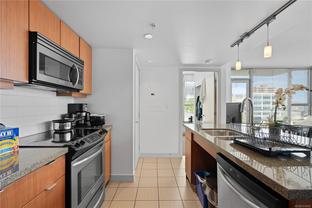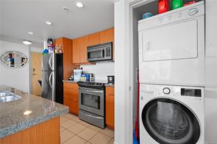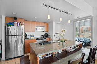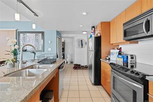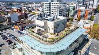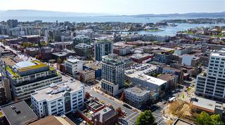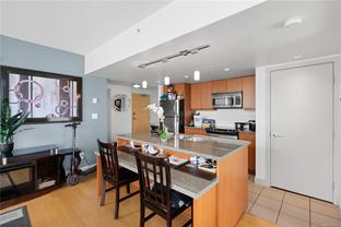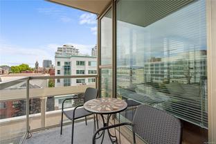 Welcome to a bright 2-bed, 1-bath condo in The Juliet, a sought-after steel and concrete building in the heart of Victoria. The floor-to-ceiling windows offer sweeping views of the city, which fill the space with natural light. The modern kitchen features ss appliances, quartz counters, a bi-level island with breakfast bar, and sleek bamboo flooring throughout. The primary bedroom includes its own access to the 4-piece bathroom. Step out onto your covered balcony, perfect for enjoying your morning coffee. This unit also features in-suite laundry, 1 secure parking stall, & bike storage. This building includes an expansive rooftop terrace, complete with a zen garden and bbq area, that wraps around the entire building showcasing 360° views of Victoria. Located steps from cafes, restaurants, shops, and everything downtown Victoria has to offer. Including an onsite caretaker and pet-friendly policies, this condo blends modern comfort with an unbeatable location.