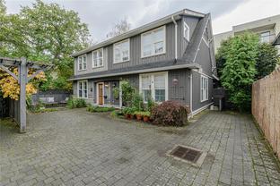 Tucked away at the back of a quiet enclave, this 2004-built strata duplex by Bruce Wilkins offers a rare combination of privacy, space, and walkability. The main floor features high ceilings, fir floors, a modern kitchen, and an open layout that makes everyday living and entertaining easy. Upstairs are three comfortable bedrooms, each with generous closets—the spacious primary bedroom is large enough to accommodate a home office or reading nook. One of the standout features is the incredible crawlspace—approximately 4’6” high at the rear and tapering slightly toward the front—spanning the full footprint of the house and providing an abundance of dry, easily accessible storage rarely found in homes like this. Outside, enjoy both a private front patio and a low-maintenance rear patio, all in a super walkable location close to parks, cafés, and shopping in Quadra Village. Perfect for first-time buyers, young families, or downsizers seeking a quiet home in a central location.