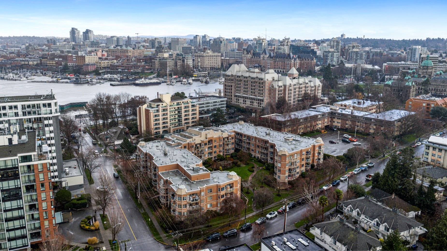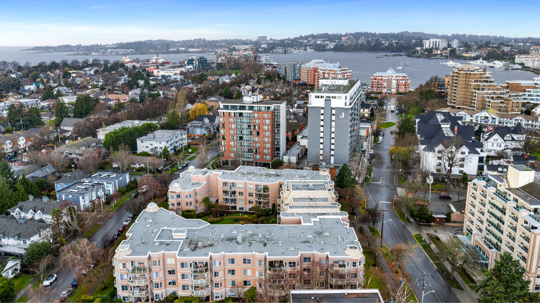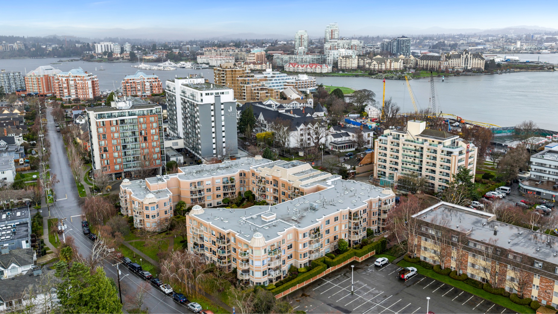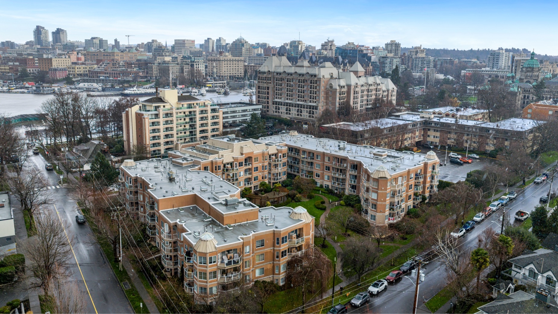 A Fabulous 1 Bedroom plus Den, 1.5 bath Condo with Garden Views and southerly sunny exposure - James Bay living at its best. This attractive condo faces the quiet side of complex and boasts a spacious, open floor plan with good size kitchen overlooking dining area viewing the wonderful mature flowering garden. The den offers great additional flexible space for a home office, or an overnight guest. The living area has a gas fireplace and has access to a large private balcony for rest or relaxation. The primary suite with walk in closet and ensuite offers opportunity for king size bed and lounge chairs for a reading nook. Step out your front door and stroll vibrant James Bay community just steps away from beautiful inner harbour/marina, restaurants, popular Fisherman's Wharf and downtown shopping. This home includes in-suite laundry, storage locker and U/G parking. Bonus - reasonable strata fee includes gas and hot water. No age limit, 1 dog or cat allowed and rentals. Proactive strata.