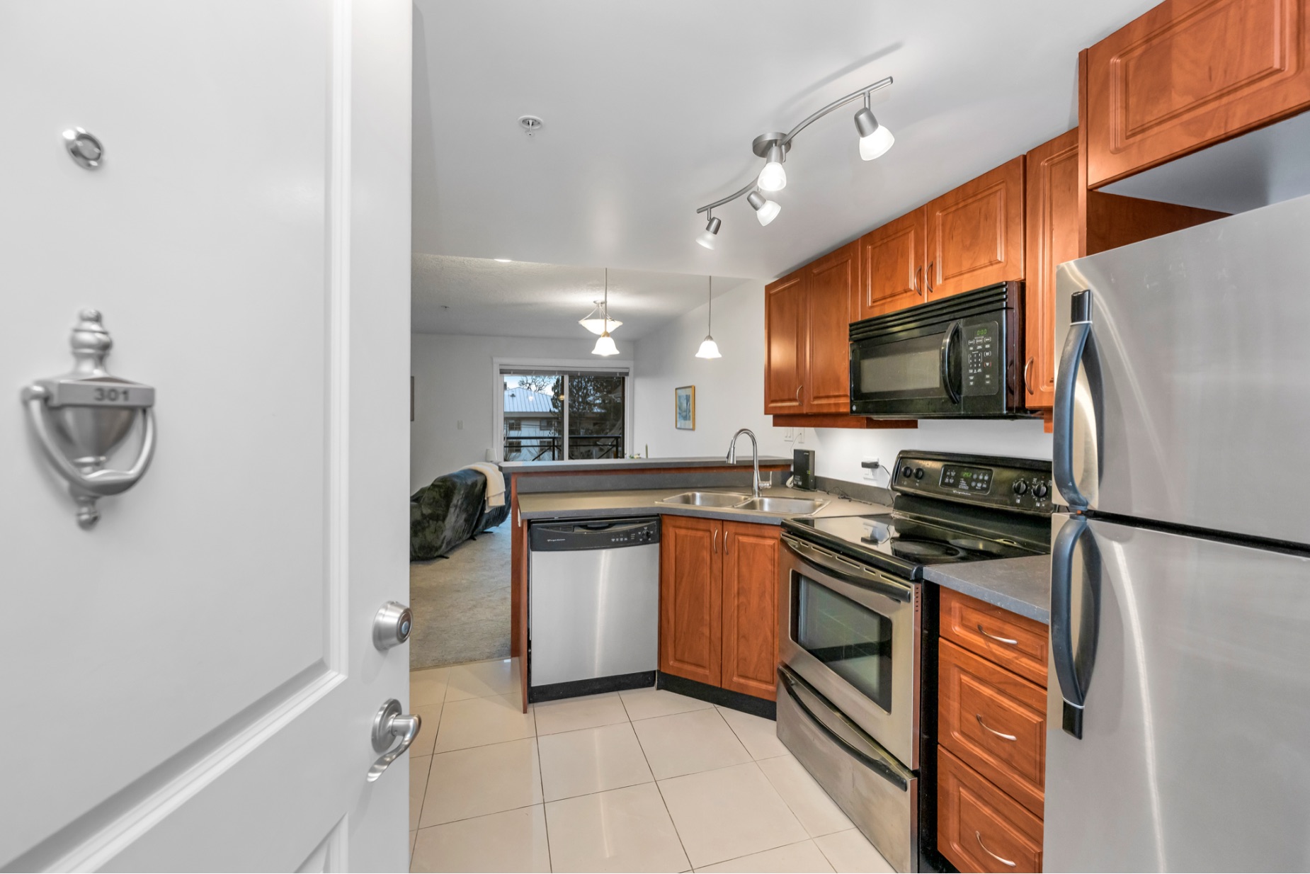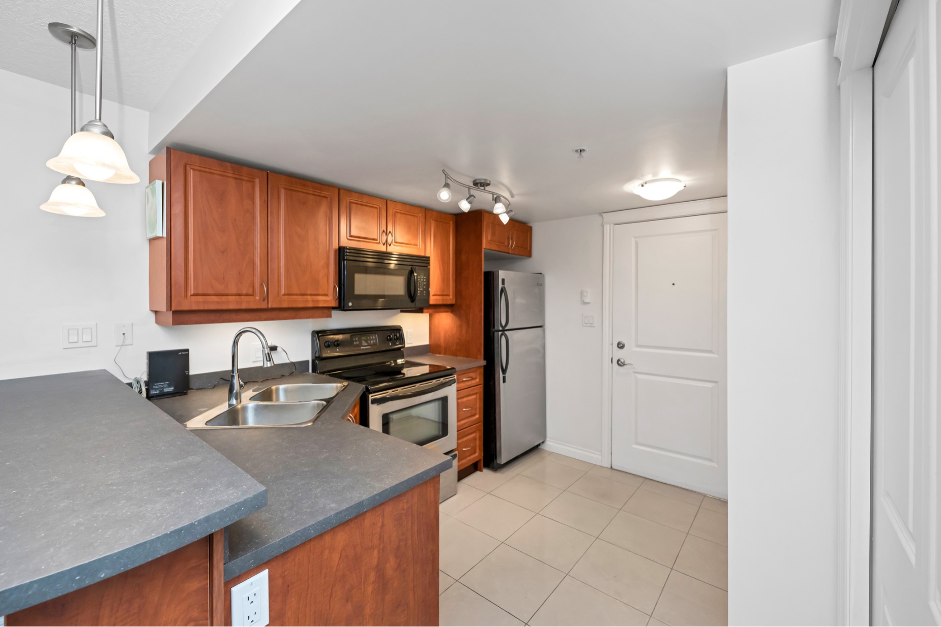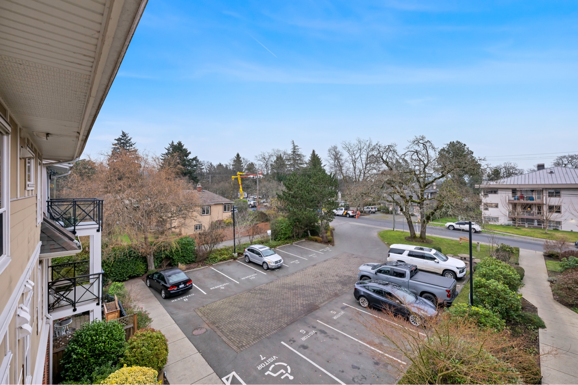 Nothing to do but move in! You will appreciate the open floor plan of this lovely bright home and enjoy the sunrises from the East facing balcony. Features include: Kitchen with stainless steel appliances (stove, fridge, dishwasher, built-in Microwave) double sink; Living Room area with electric fireplace; Dining area with access to balcony where you can relax and BBQ; Primary bedroom with a large walk-in closet; plus a 4 piece Bath and in unit Laundry. Built in 2008, this 55+ building includes a secured entrance, a common room where you can enjoy various activities or just grab a book and relax, separate locker (on the same floor), visitors parking and underground secured parking for one vehicle. The location is excellent - a short stroll to the Royal Oak Shopping Centre plus Restaurants all nearby. Whether you are an empty nester or retiree, you will be impressed by the condition, location and price of this one bedroom home. Call your Realtor today for a private viewing.