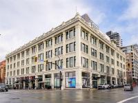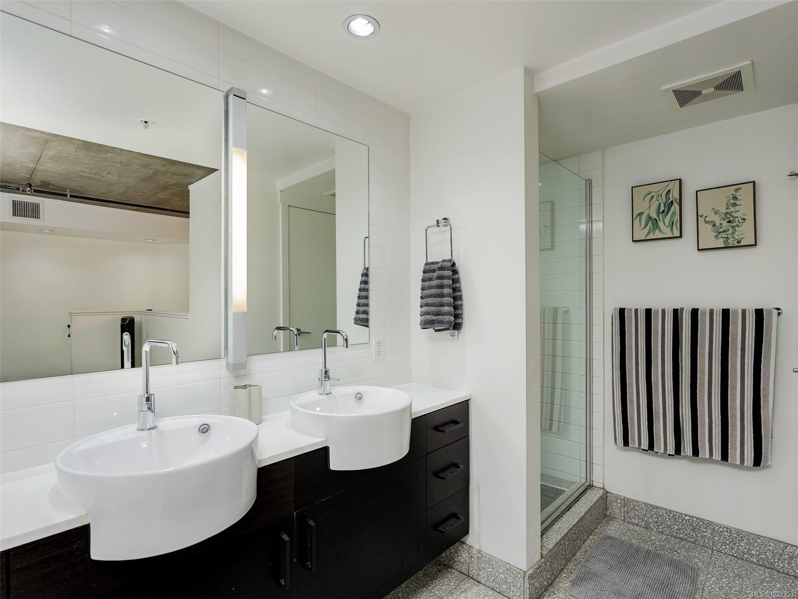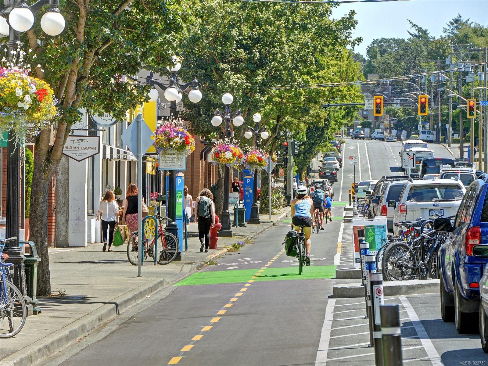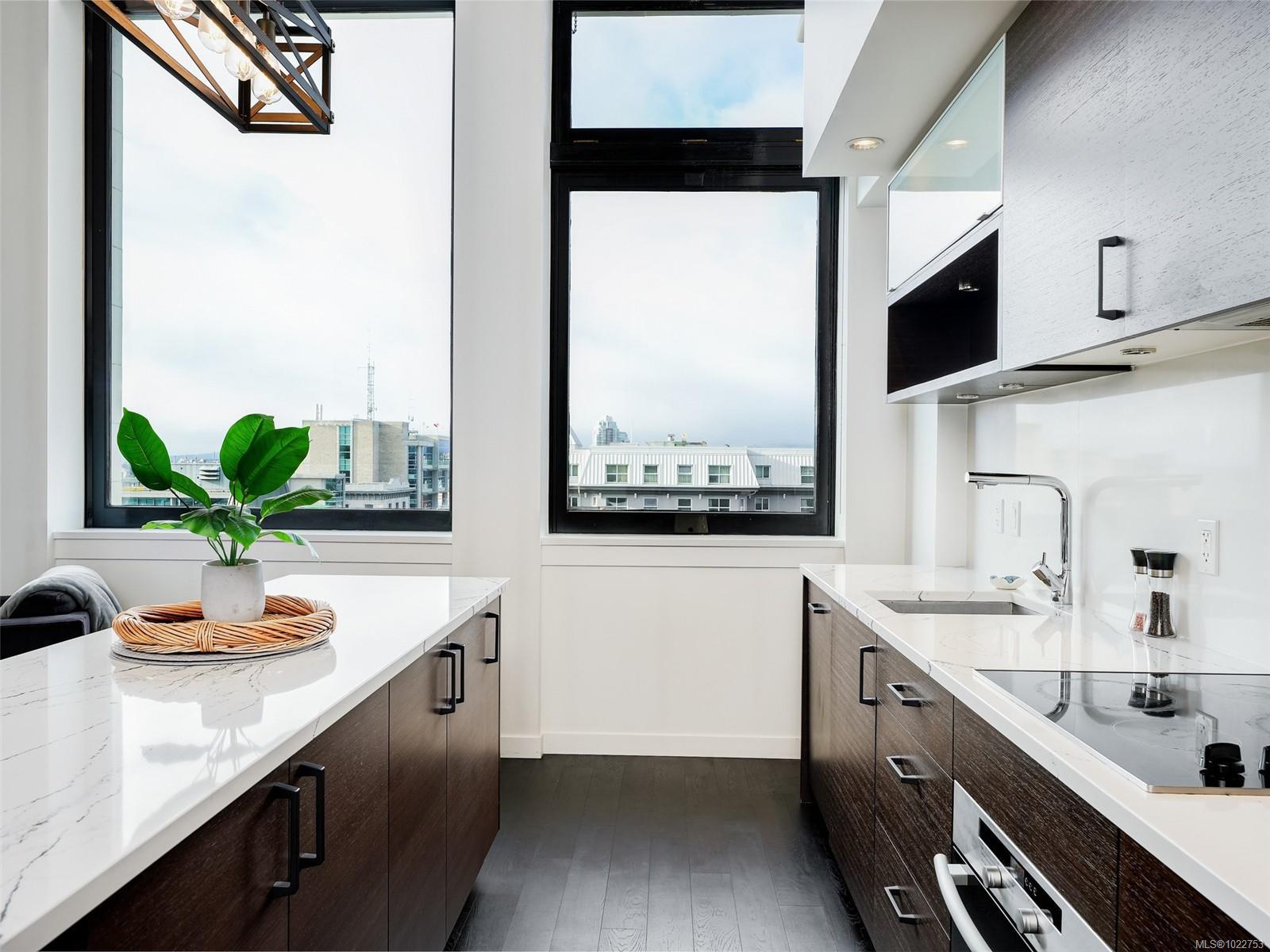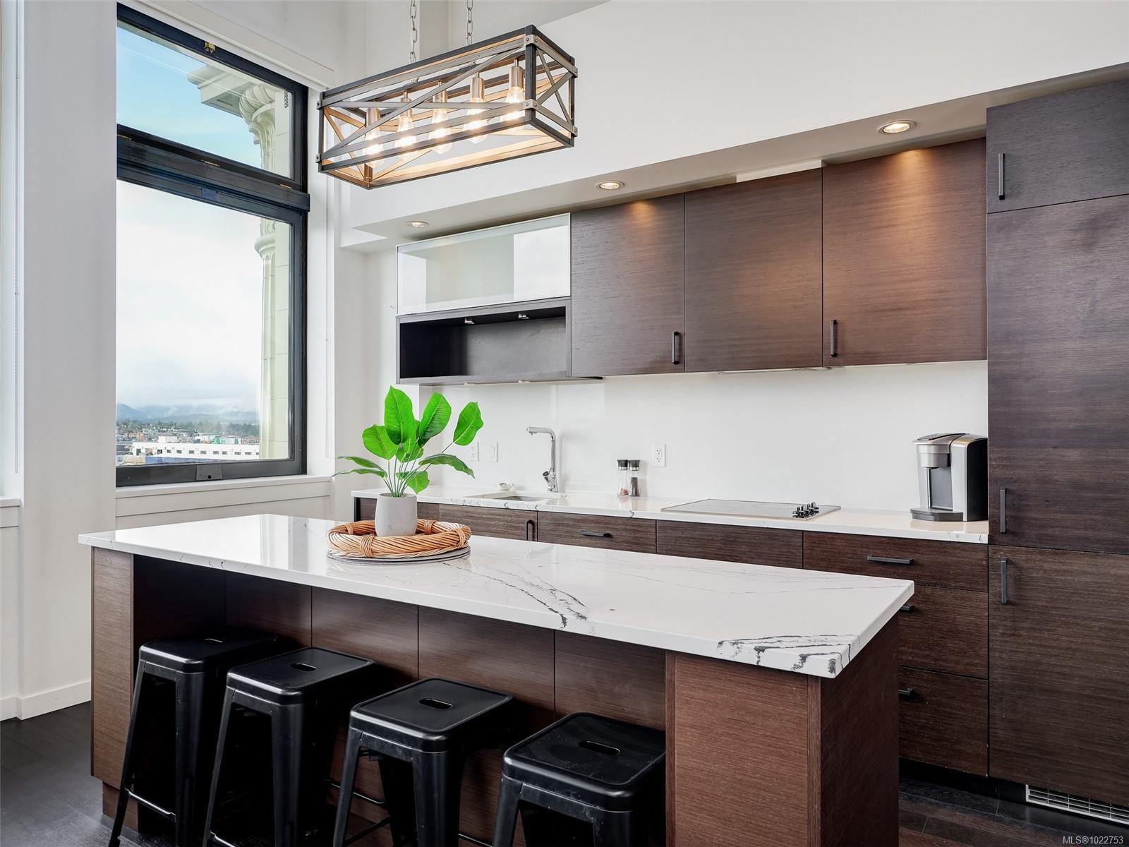 OPEN HOUSE THIS SAT & SUN JAN 10, 11th FROM 1-3 PM. Here is your opportunity to own a piece of Victoria’s history at the Iconic "HUDSON". This BRIGHT 2 BED, 2 BATH WEST FACING loft condo boasts open concept, modern design w/17 ft. ceilings & oversized windows that offer Sunset, Ocean, City & Mountain views. This 4th floor condo features engineered hardwood floors, Geothermal heating & cooling, in-suite laundry, Stainless Steel appliances, Quartz countertops & CUSTOM ISLAND ideal for entertaining! Main level is complete with a bedroom w/sliding glass doors & 3-piece bathroom. Upstairs you will find the loft style primary bedroom & 5-piece ensuite w/heated floors, double vanity, soaker tub and walk-in shower. Rentals and pets allowed. Amenities include secure underground parking, storage locker, BONUS Guest suite, expansive 14,000sqft ROOF TOP PATIO w/lounge chairs, BBQ’s & incredible views! Steps to restaurants, shopping all in the Conde Nast Traveler "WORLD #1 SMALL City" - VICTORIA!