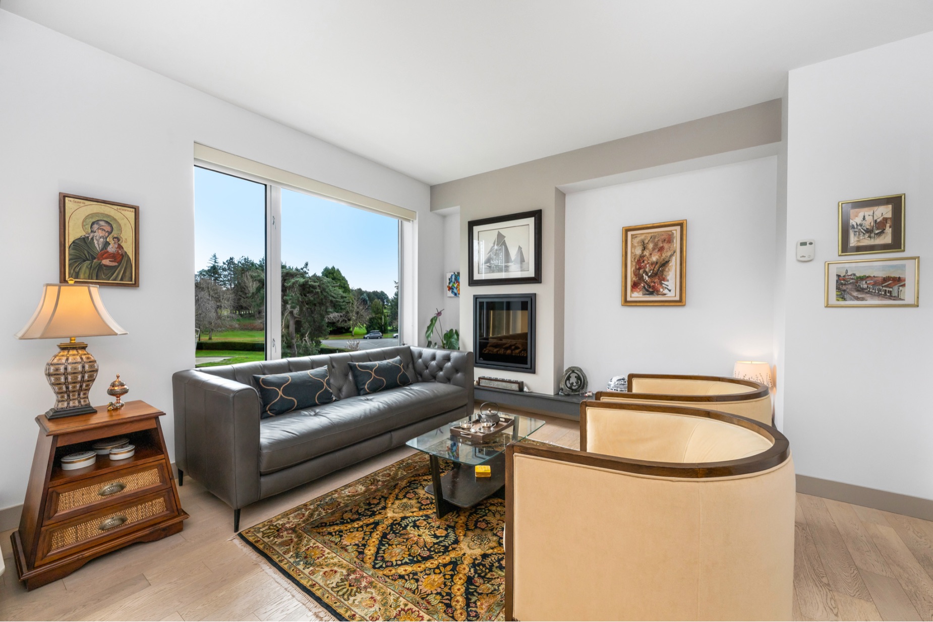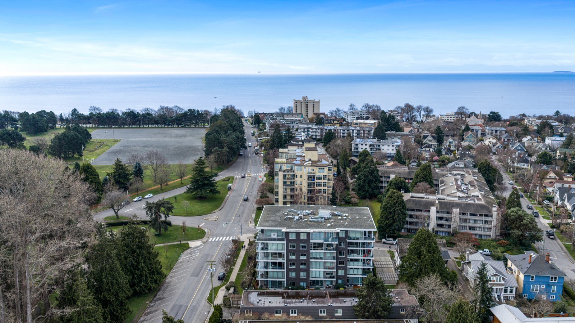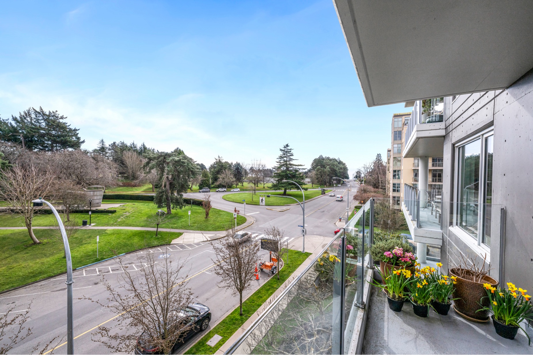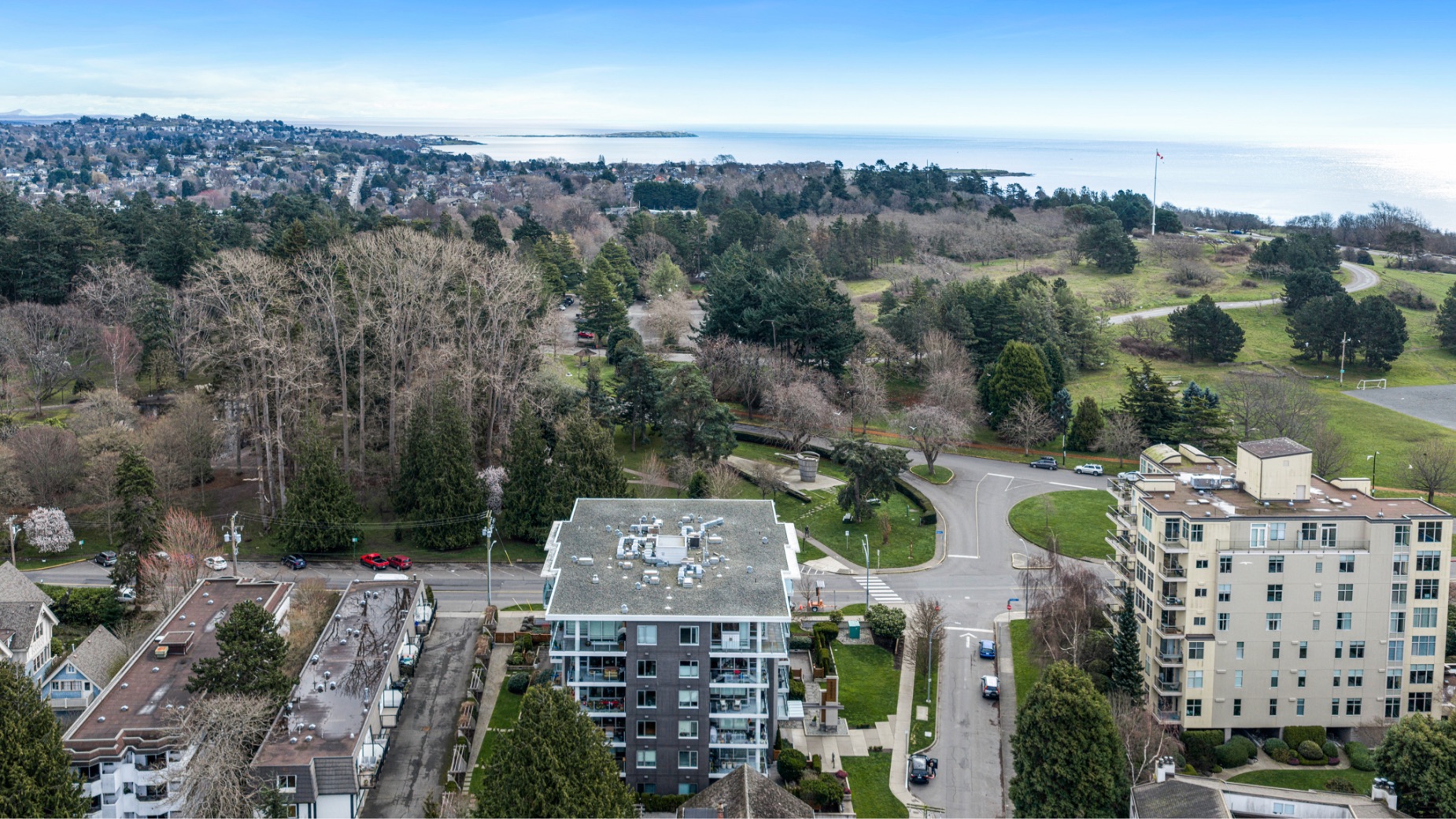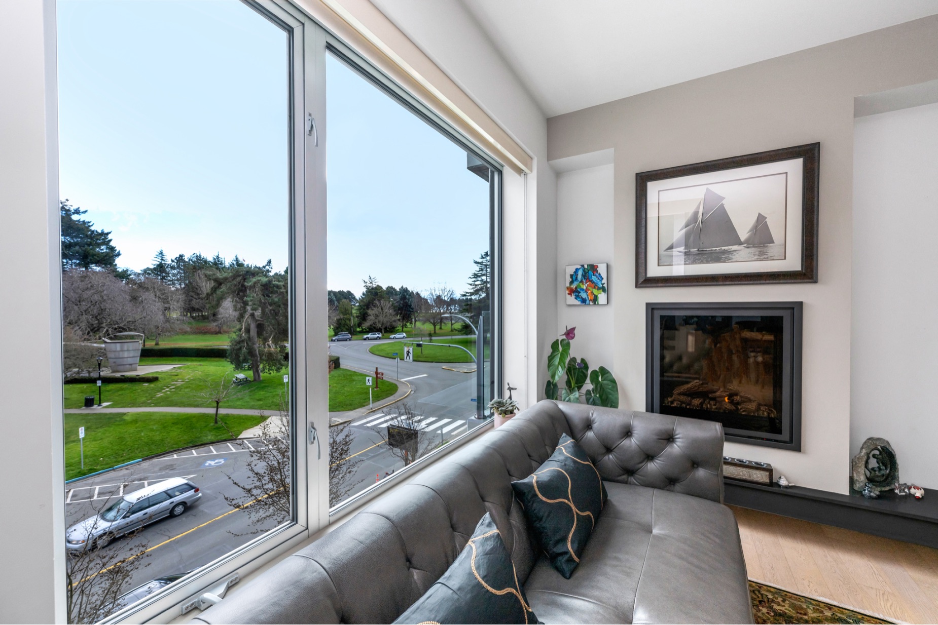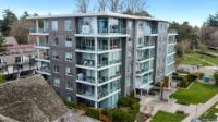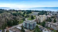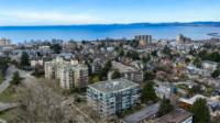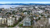 Experience luxurious urban living in this bright, beautifully appointed 4th-floor unit at “Douglas on the Park,” a premier steel-and-concrete building with stunning unobstructed Beacon Hill Park views and steps from the Dallas Rd waterfront. This 860+ sqft residence offers 1 bedroom + spacious den (ideal office or 2nd bedroom) and 1 elegant bath. Features include 9' ceilings, floor-to-ceiling windows, hardwood floors, and a modern fireplace. The chef-inspired kitchen boasts quartz countertops and premium stainless-steel appliances. The generous primary bedroom provides ample closet space, while the spa-like bath offers dual vanities, a soaker tub, glass shower, and heated floors. Includes secure underground parking, large storage locker, bike storage, EV charging, and pet-friendly living. Prime James Bay location near Cook St Village and downtown—walkable city living surrounded by nature, oceanfront paths, and vibrant community amenities.
