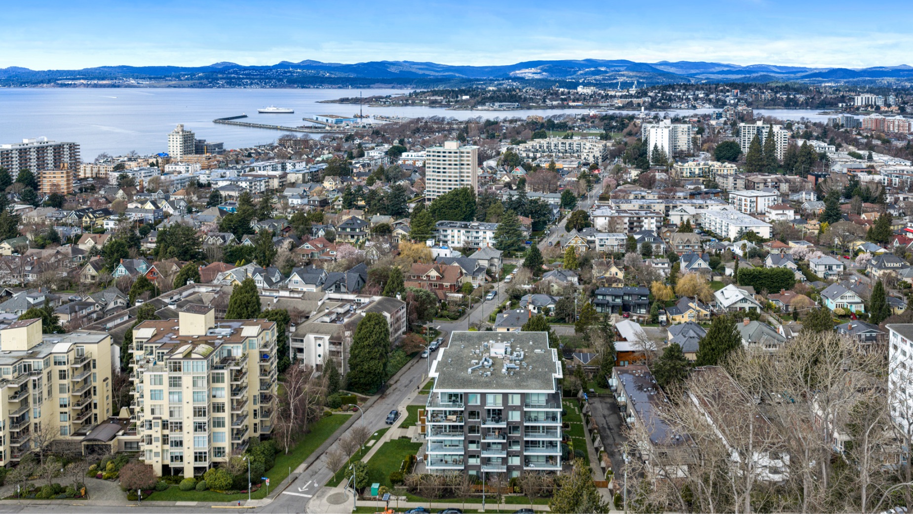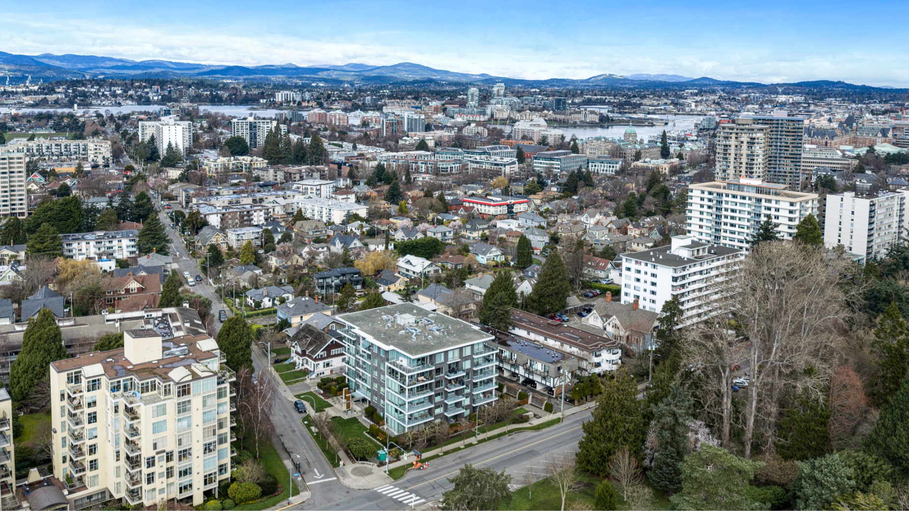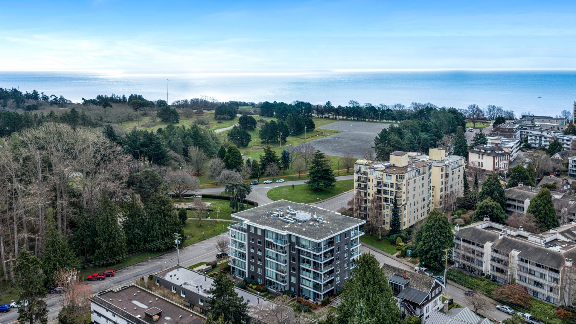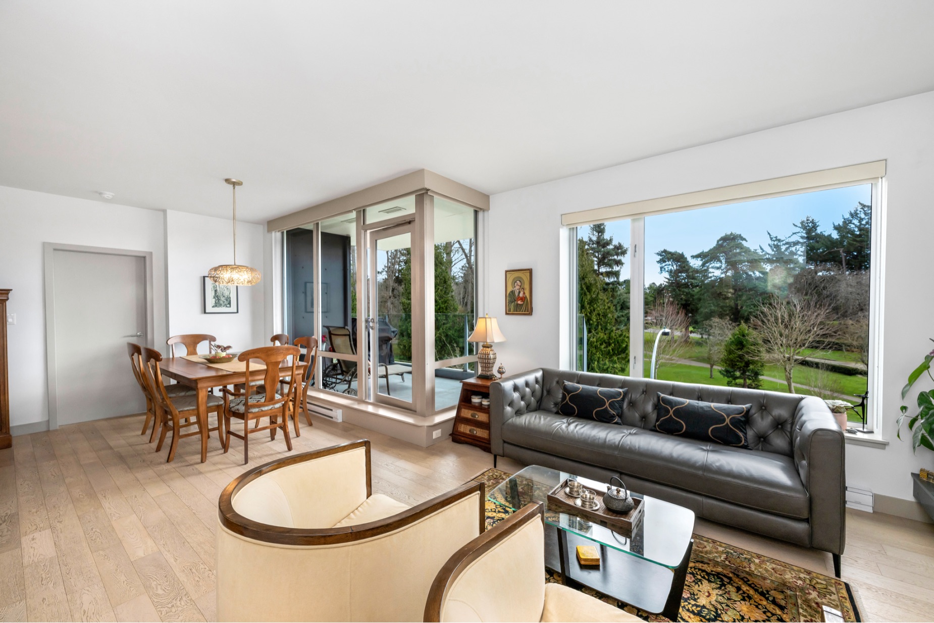 Experience luxurious urban living in this bright, beautifully appointed 4th-floor unit at “Douglas on the Park,” a premier steel-and-concrete building with stunning unobstructed Beacon Hill Park views and steps from the Dallas Rd waterfront. This 860+ sqft residence offers 1 bedroom + spacious den (ideal office or 2nd bedroom) and 1 elegant bath. Features include 9' ceilings, floor-to-ceiling windows, hardwood floors, and a modern fireplace. The chef-inspired kitchen boasts quartz countertops and premium stainless-steel appliances. The generous primary bedroom provides ample closet space, while the spa-like bath offers dual vanities, a soaker tub, glass shower, and heated floors. Includes secure underground parking, large storage locker, bike storage, EV charging, and pet-friendly living. Prime James Bay location near Cook St Village and downtown—walkable city living surrounded by nature, oceanfront paths, and vibrant community amenities.