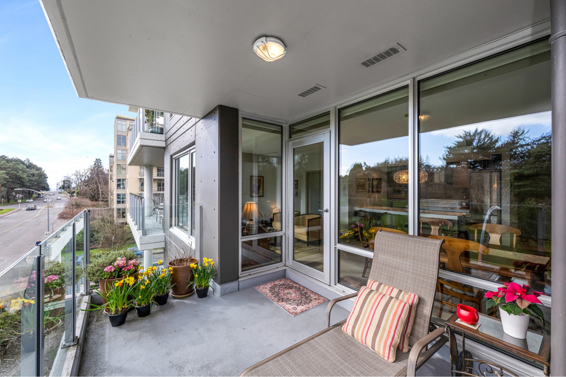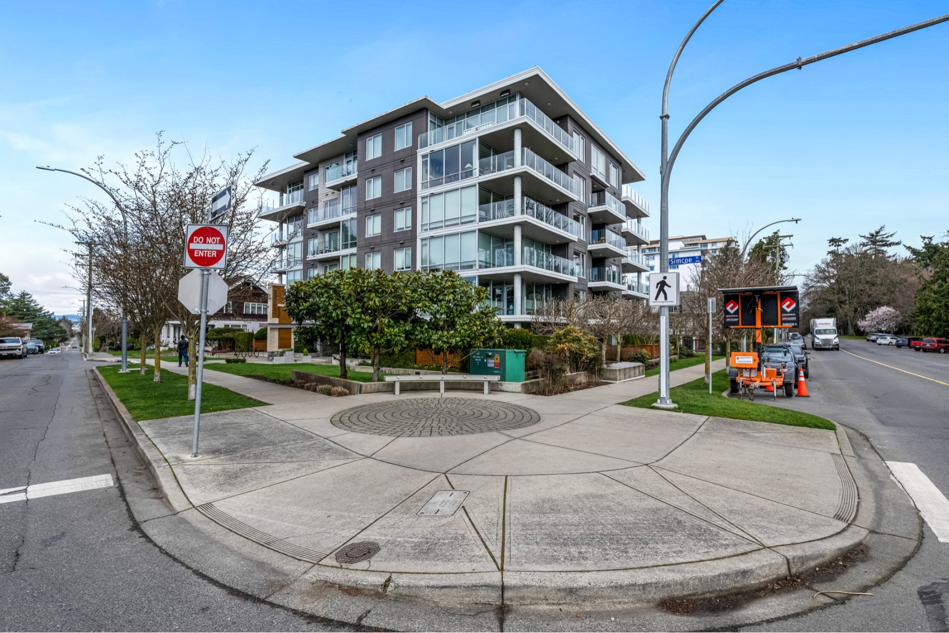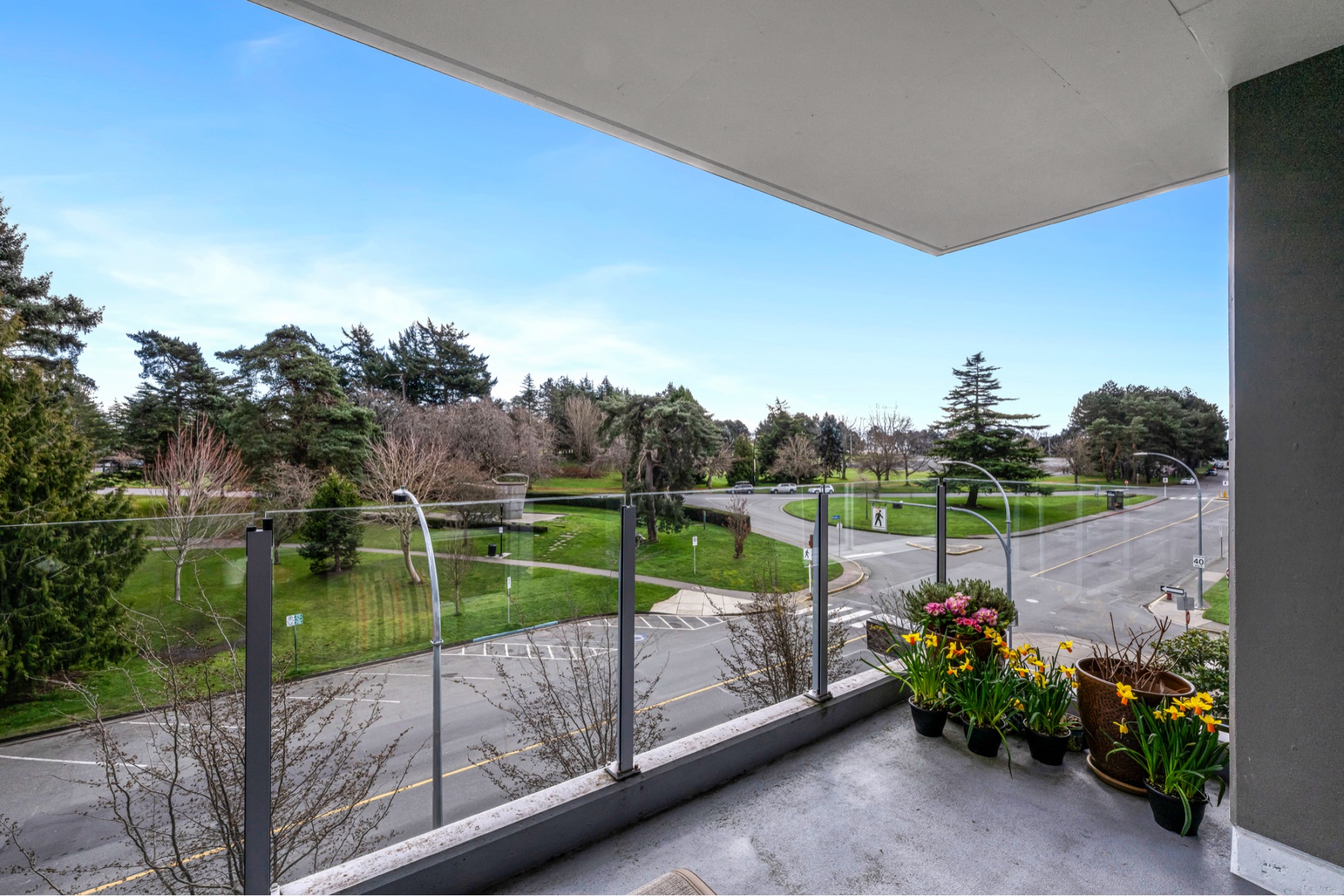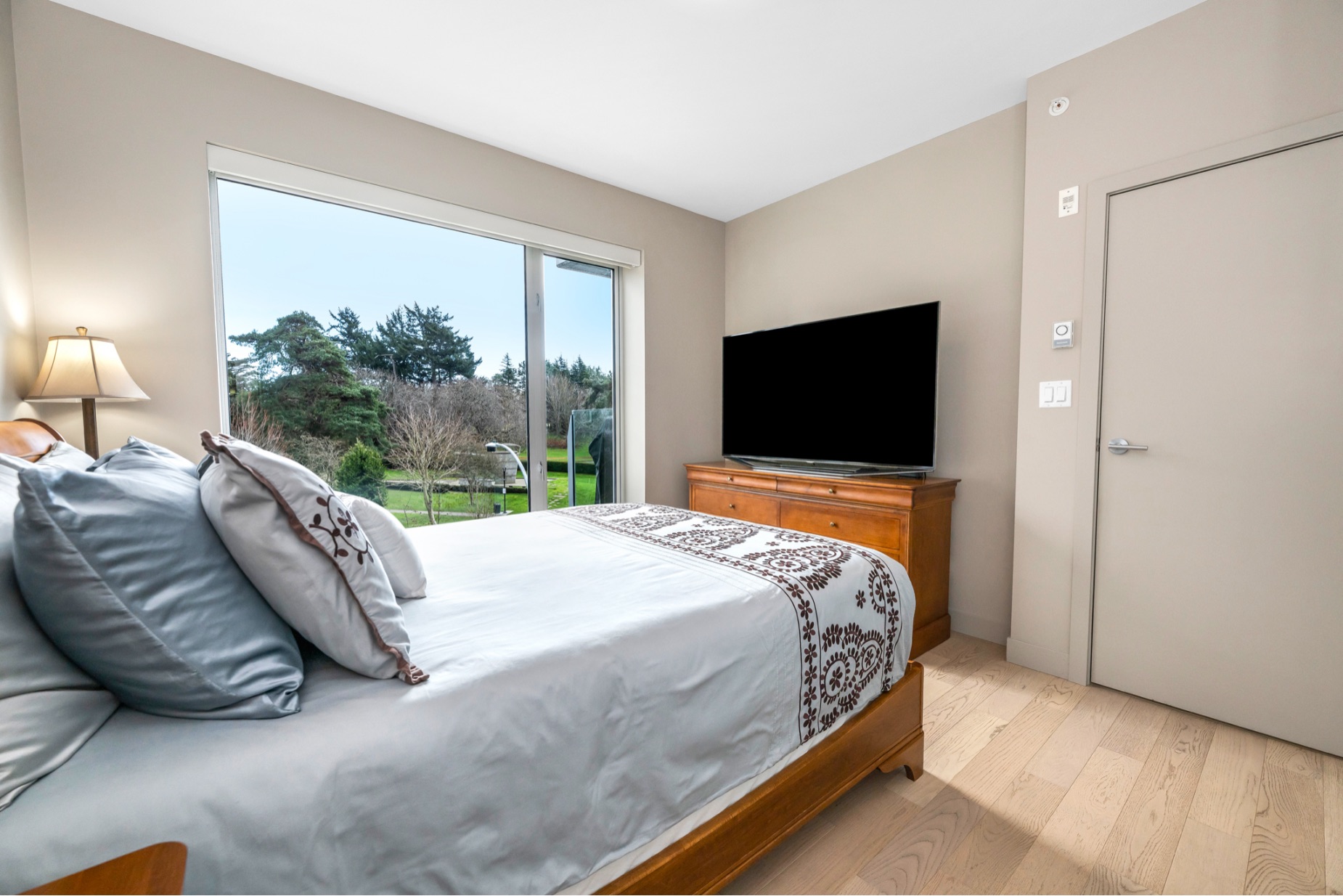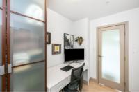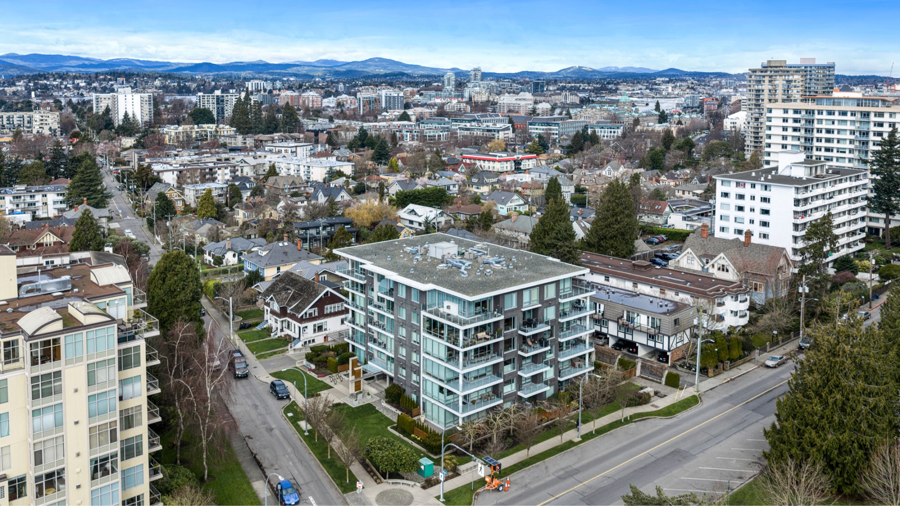 Experience luxurious urban living in this bright, beautifully appointed 4th-floor unit at “Douglas on the Park,” a premier steel-and-concrete building with stunning unobstructed Beacon Hill Park views and steps from the Dallas Rd waterfront. This 860+ sqft residence offers 1 bedroom + spacious den (ideal office or 2nd bedroom) and 1 elegant bath. Features include 9' ceilings, floor-to-ceiling windows, hardwood floors, and a modern fireplace. The chef-inspired kitchen boasts quartz countertops and premium stainless-steel appliances. The generous primary bedroom provides ample closet space, while the spa-like bath offers dual vanities, a soaker tub, glass shower, and heated floors. Includes secure underground parking, large storage locker, bike storage, EV charging, and pet-friendly living. Prime James Bay location near Cook St Village and downtown—walkable city living surrounded by nature, oceanfront paths, and vibrant community amenities.
